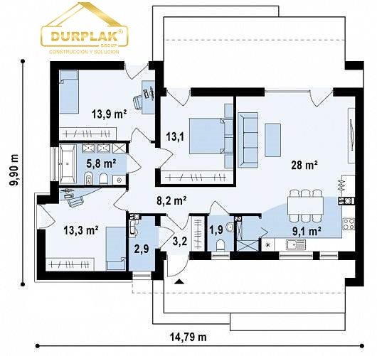 Este diseño de casa modular es uno de los más elegidos por nuestros clientes, ya que debido a su superficie relativamente reducida, es ideal para parcelas de pequeño tamaño. Esto no es un problema para incorporar 3 dormitorios y dos baños. Es una buena elección para instalar su casa modular en su parcela.